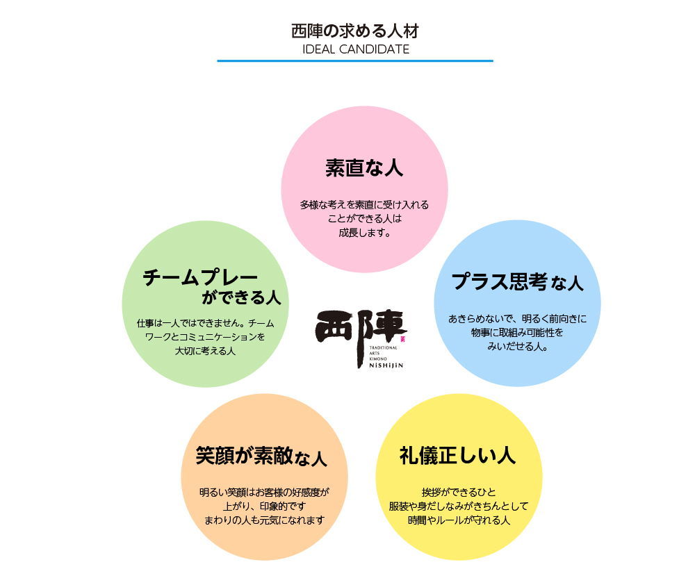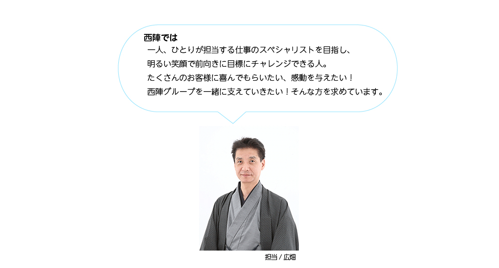 - 例)きもの工芸西陣 総合職:固給180,000円 +外商手当 20,000円+スタイリスト資格(取得によりことなる )
